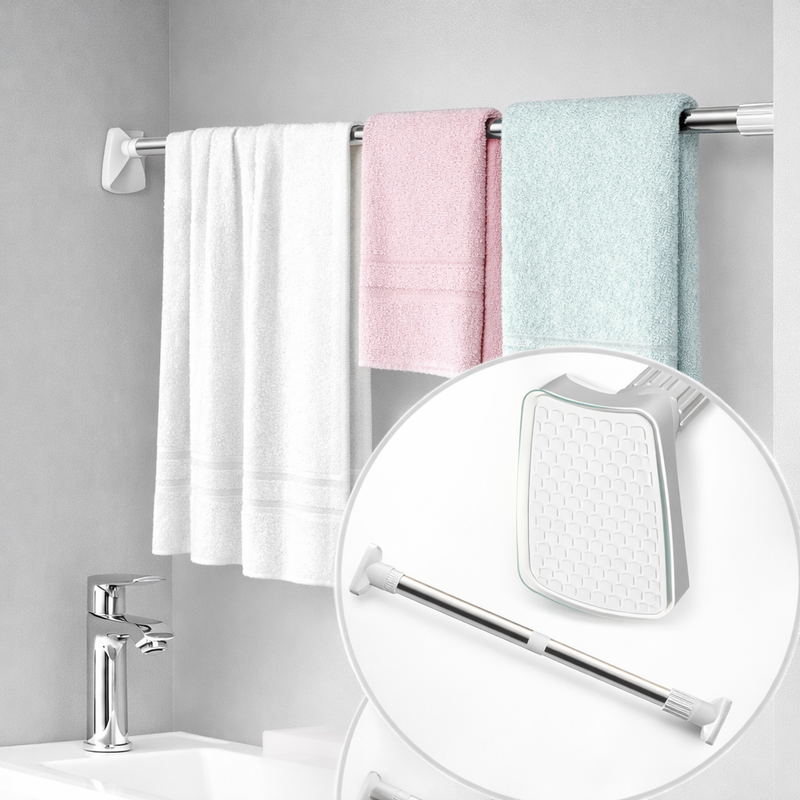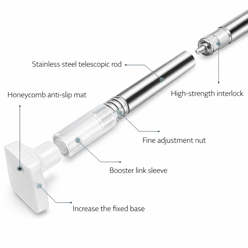 Upgrade your space with this premium stainless steel telescopic rod, designed for strength, stability, and effortless installation. Featuring a high-strength interlock system and precision fine-adjustment nut, it ensures a secure, slip-free fit in any space. The reinforced fixed base combined with a honeycomb anti-slip mat provides superior grip while protecting your walls from damage.